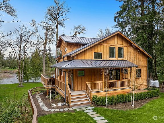 Riverfront living at its best in charming Fall City. This sun-drenched home sits safely above the flood plain & enjoys expansive vistas of the river, babbling creek, golf course, & mountains. The layout reveals generous yet intimate spaces that capture views from every vantage. Featuring a bed & bath on each floor, great room with cook’s kitchen and eating nook, the home was custom built in 2021 with fine finishes & to exacting standards. Extend living space to the large wrap-around composite deck that connects the home to 3.3 acres & 149 ft of riverfront. A partially finished basement with potential stairs to the main level has endless possibilities-you decide. Easy-care yard, large shed & quality driveway complete this exquisite property.