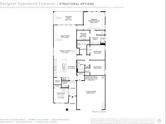 Step into this beautifully crafted new construction home, boasting 10-foot ceilings and an open, airy layout. The inviting foyer welcomes you, leading to a versatile flex room perfect for a home office or media room. At the heart of the home is an upgraded kitchen that any chef will love, featuring a gas cooktop with exhaust hood and built-in wall micro wave and wall oven. Ample cabinetry and a convenient butler's pantry is an entertainers dream. The kitchen flows seamlessly into the expansive great room where a 9' stacked door opens to a covered patio. Enjoy the outdoor living year-round with a cozy stone, gas fireplace, perfect for entertaining and relaxing. The spacious primary suite offers a private retreat, complete with a sophisticated soffit ceiling and a luxurious ensuite bathroom. The zero-entry shower provides both style and accessibility, creating a spa-like experience every day. The Pines at Sugar Creek is Charlotte's newest 55+ Active Adult community near Ballantyne.