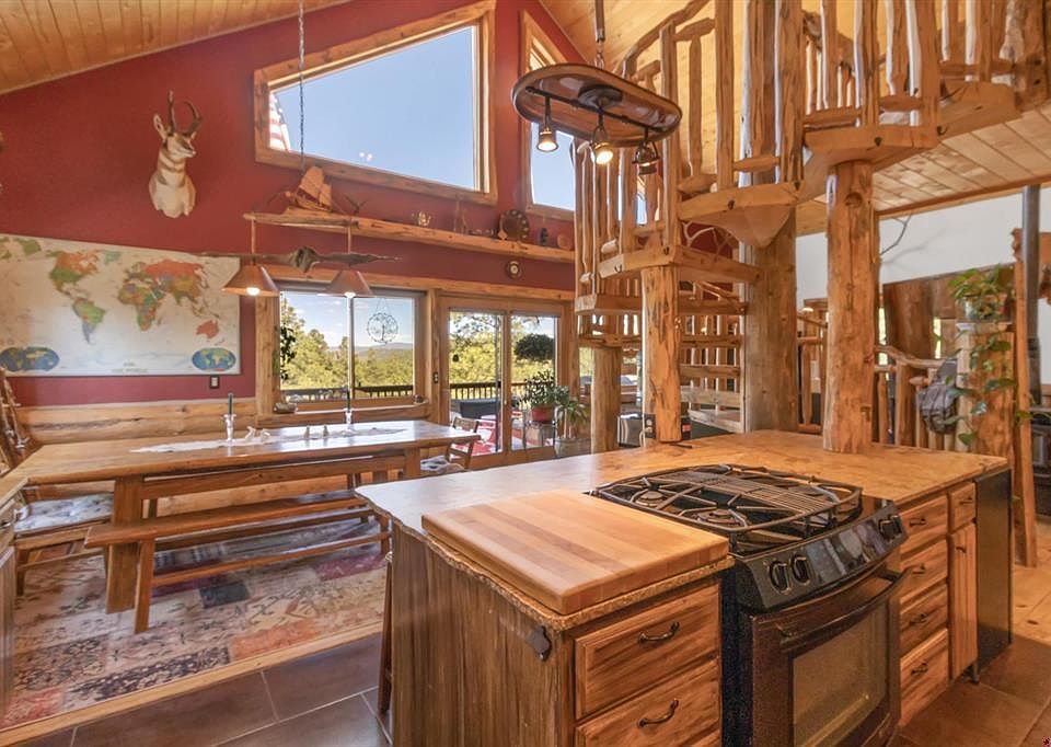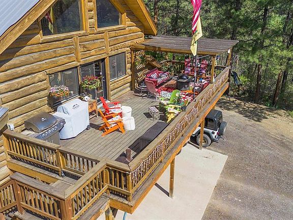 Planning to enjoy a Colorado summer, you will need to secure this home asap! If your home checklist includes ample garage and storage space, privacy, bordering public land, and a love for the style of a log home without the need for costly chinking repairs, this house meets all those criteria. Nestled on 40 acres with partially paved access, this gorgeous home is located just moments off County Road 502. Though it looks like a log home, it is stick-built, showcasing an authentic “Colorado” aesthetic. The home features a full downstairs ADU (appears as a gym in media footage) and ample living space upstairs, making it versatile to suit your needs. Currently, the owner uses the downstairs ADU as a workout room and storage, but it is well-suited for multi-family living. The garage offers 3+/- vehicle parking with in-floor heating and extensive storage spaces for gear. Inside the home, you'll find granite countertops, reverse osmosis filtration systems for water, and a well that produces a good supply. On the main level, there is a spacious primary bedroom, nice sized closet, with a private walk-out deck to a hot tub and a stunning stone floor bathroom equipped with a walk-in shower and double vanity. Additionally, there is another room used for storage. The main level also features a small living room, while the third floor has a large living room, perfect for a media room. This floor also includes two additional bedrooms that can serve as a home office or craft room. The highlight of this home is the main deck with breathtaking views of the meadows, mountains, and bluffs. The outdoor space includes a lush lawn and a mile built out hiking/biking trail loop that passes through an upper meadow with a shooting blind and target range. There is also potential for building additional dwellings and additional electric hook ups, with a four-wheeler trail already in place. At the beginning of the property, there is a flattened area where the seller intended to install a shop. Additional features include a chicken coop, a UTV storage shed, and full RV hookups off the house.