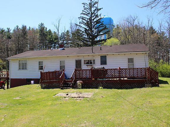 6.96 acres of land with public water located off the main highways with rolling hills, woods and quiet country views. 4 bedrooms, full bathroom, large eat in kitchen with plenty of cabinets and counter space. Large living area with beautiful hardwood floors beneath the carpet. Full walkout basement with 1 car built in garage, side and rear wood decks. Property being sold ''As Is''.