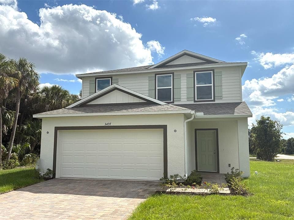 Known for its abundance of parks and the scenic Myakka State Forest, North Port offers residents a lifestyle filled with outdoor adventures and recreational opportunities. The city’s ideal location also provides easy access to shopping, dining, and top-rated schools, making it the perfect place to call home. Introducing "The Lancaster", a stunning two-story home built on a prime corner homesite, and a gem within our Heritage Collection. This residence seamlessly blends timeless elegance with modern comfort, featuring an upscale paver driveway and entry walk, offering outstanding curb appeal. Step inside to an inviting open foyer that leads you into thoughtfully designed living spaces. The main floor boasts a spacious open-concept layout, seamlessly connecting the modern kitchen, dining area, and great room. Upgraded impact windows throughout the home enhance safety and energy efficiency, while soft-close shaker cabinets with granite countertops in the kitchen provide both elegance and functionality. The kitchen is further enhanced by stainless steel appliances, perfect for culinary adventures and everyday gatherings. Ceramic plank tile flooring in the main living areas adds durability and style, and upgraded LED lights in the great room create a bright, welcoming atmosphere. This home is thoughtfully designed with the highly desirable 4th bedroom and full bath located on the first floor, offering flexibility for guests or multi-functional use. The second floor features a spacious loft area, ideal for a media room, office, or relaxation space, and is highlighted by designer railings that add a touch of sophistication. The master suite serves as a luxurious private retreat, complete with an ensuite bathroom featuring a walk-in tile shower with a shower enclosure, offering a spa-like experience. The master also boasts a spacious walk-in closet for ample storage. The exterior of The Lancaster reflects the enduring charm of the Heritage Collection with architectural details that add character to the home’s facade. Driveway pavers and entry walk pavers enhance the overall curb appeal. The home is also equipped with an irrigation system for easy lawn maintenance and lush landscaping. A 2-car garage and full screened patio complete the functional layout of this beautifully crafted home, offering ample space for parking, storage, and outdoor living. Experience the perfect blend of classic design and modern amenities in The Lancaster, a home ideal for those who seek both style and comfort. Full builder warranty included!