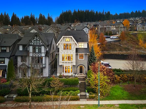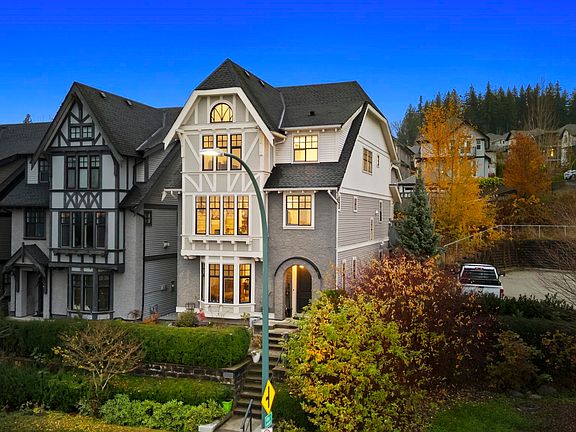 Beautifully maintained Burke Mountain home by Mosaic with lane access and valley views. Three-level Tudor-inspired design with over 3500 sq.ft., 5 beds and 4 baths. Main floor features 9' ceilings, an expansive chef-style kitchen with large quartz island, stainless appliances, and a spacious living area with room for office or play space. Walk-out patio off kitchen with mature landscaping. Upper level has a large primary suite with organized walk-in closet, valley outlook and spa-style ensuite. Lower level includes a high-end legal one-bed suite with potential to convert to two beds. Extra parking off rear lane suitable for larger vehicles. Steps to Coast Salish, transit and parks. New middle and high school coming 2026. Open House Saturday Nov 22 2-4pm.