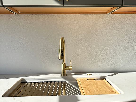 As you enter the gated courtyard, you proceed up the stairs to the JADU's separate entrance. You will find a large open living space with high ceilings, abundant natural light, luxury vinyl planking flooring, and a kitchenette equipped with new cabinets, a full size fridge, oven and cooktop, full size sink, washer/dryer combo unit and private AC/heating for the JADU.