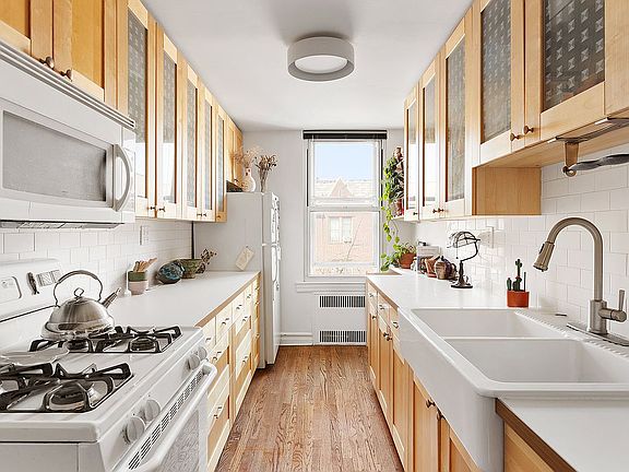 This sunny and spacious 925 square foot corner 1BR/1BA is sure to charm you. A proper foyer with multiple closets flows into an enormous living and dining space, offering tremendous flexibility of use, including space for a home office. The living room itself can accommodate a large dining table and seating area, while the adjacent, windowed kitchen will appeal to the aspiring chef. The large, corner bedroom has two exposures, lots of sunlight, room for a King-sized bed and plenty of closet space. Unit #4E has 9 foot ceilings and gorgeous hardwood floors throughout, and has been recently renovated.