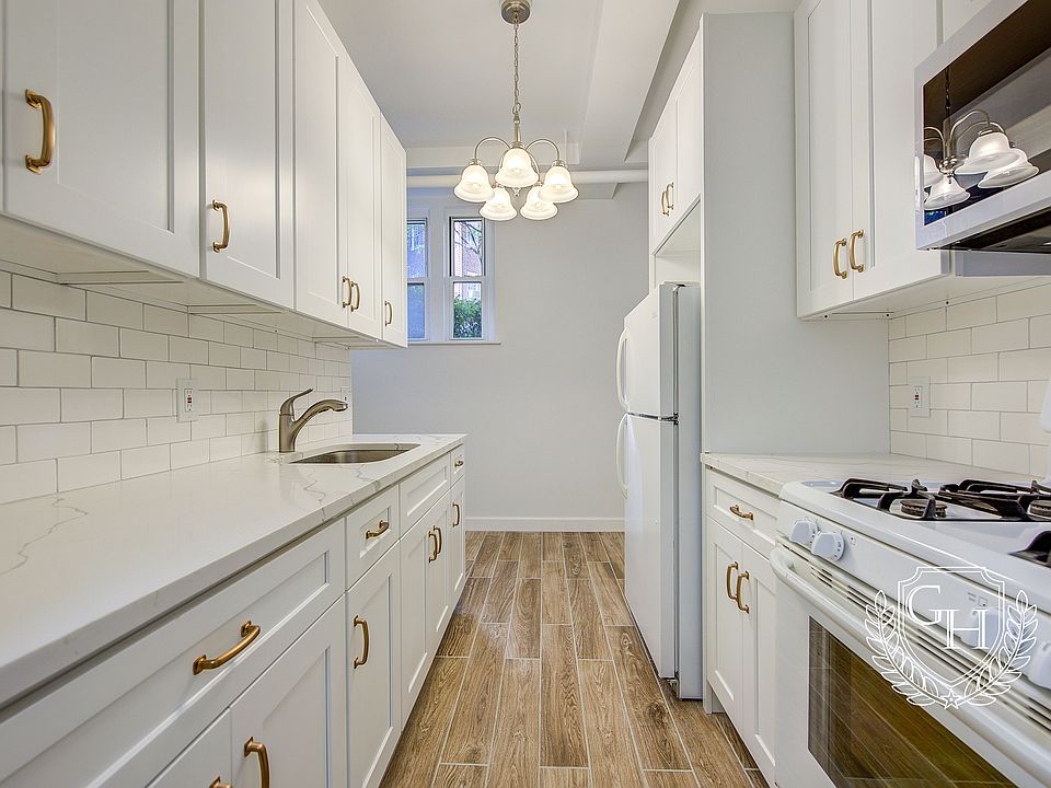 This basement apartment offers large windows that provide natural light, along with a spacious layout. The large eat-in kitchen is outfitted with white soft-close cabinets, quartz countertops and complimentary white appliances (gas stove, refrigerator, and microwave). The bathroom has been fully updated with clean, contemporary details. The apartment has four closets, high ceilings and is move-in ready.