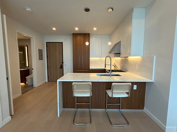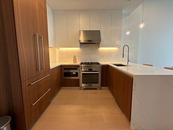 The U-shaped kitchen is designed for culinary excellence, featuring sleek Calacatta Quartz countertops and exquisite Italian accents. The bathroom is a sanctuary of tranquility, adorned with Calacatta matte porcelain tiles, custom walnut wood veneer vanities topped with Quartz marble, and programmable radiant heat floors, ensuring ultimate comfort. With ample outdoor space, the residence provides a serene escape from the city's hustle and bustle.