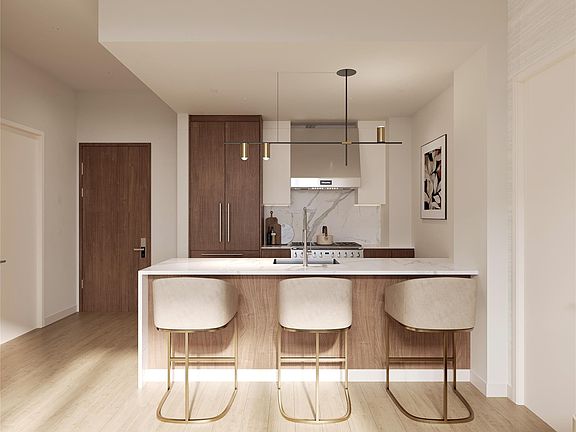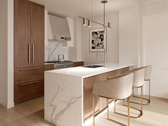 The Residence offers a charming urban retreat. The U-shaped kitchen showcases sleek features, including Calacatta Quartz countertops and exquisite Italian accents, promising culinary excellence. Facing south, this residence treats you to picturesque views of downtown Flushing, flooding the space with natural light. With ample outdoor space, The residence provides a tranquil escape for relaxation. The integration of the Latch Smart Lock System and Wi-Fi-enabled appliances enhances modern living with effortless convenience. The residence boasts soaring high ceilings, accentuating its spacious and luxurious ambiance. In the bathroom, Calacatta matte paorcelain tiles, custom walnut wood veneer vanities topped with Quartz marble, and programmable radiant heat floors create a tranquil retreat. The residence epitomizes sophisticated urban living, blending modern comforts and captivating views seamlessly.
