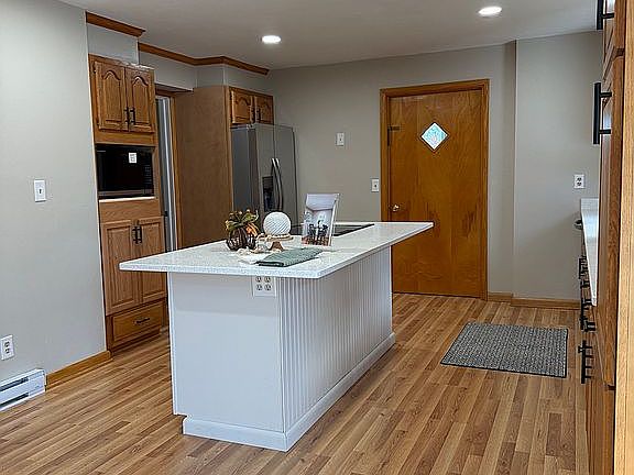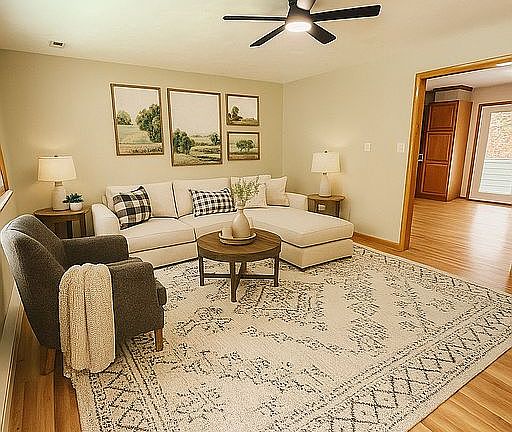 This stunning white brick home with board-and-batten siding and gray shutters offers modern upgrades and timeless charm on nearly one acre in town. Featuring 3 bedrooms, 2.5 bathrooms, and a thoughtfully designed layout, this home perfectly balances comfort and style.