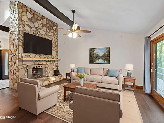 The inviting great room showcases a dramatic floor-to-ceiling stone fireplace and rich luxury vinyl plank flooring, creating a warm yet modern atmosphere. The kitchen includes all appliances—only four years old—and opens easily to the dining and living areas, making entertaining a breeze.