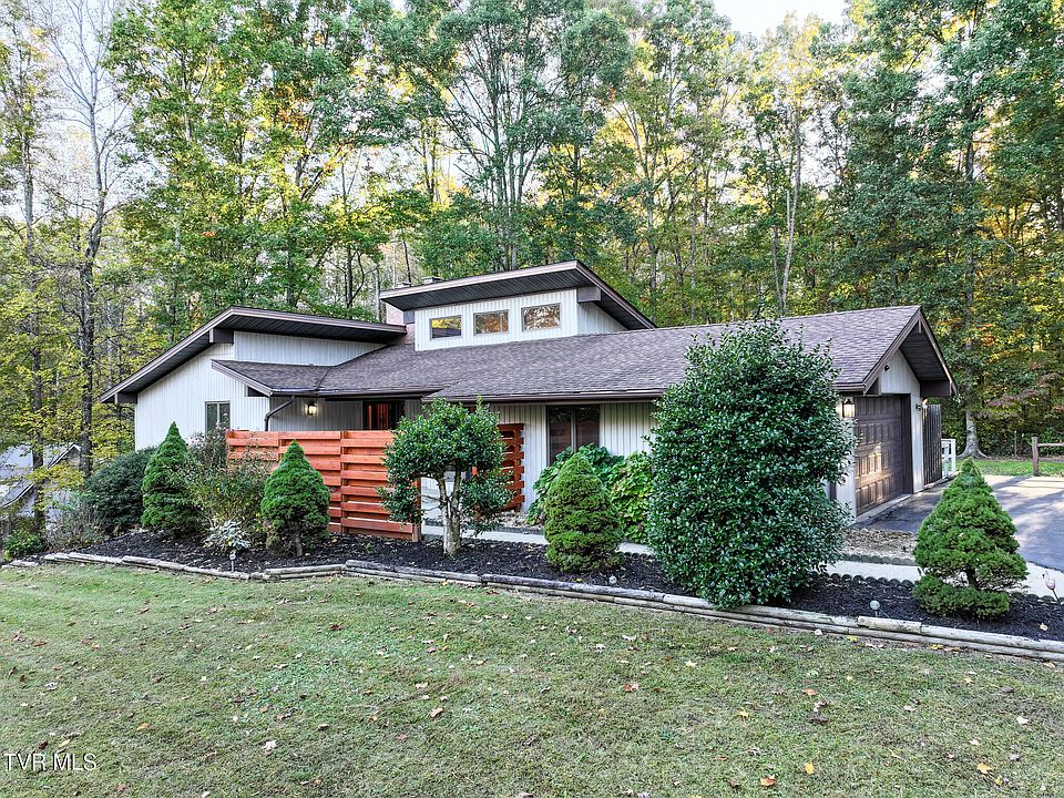Tucked among mature trees, this striking contemporary home combines modern architecture with a private, wooded setting. The exterior showcases clean lines, a unique multi-level roofline, and beautiful wood accents that add warmth and style. Large windows invite natural light into the home while connecting indoor spaces with the scenic outdoors.