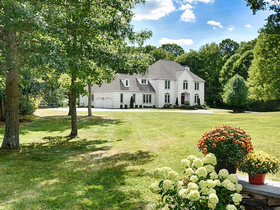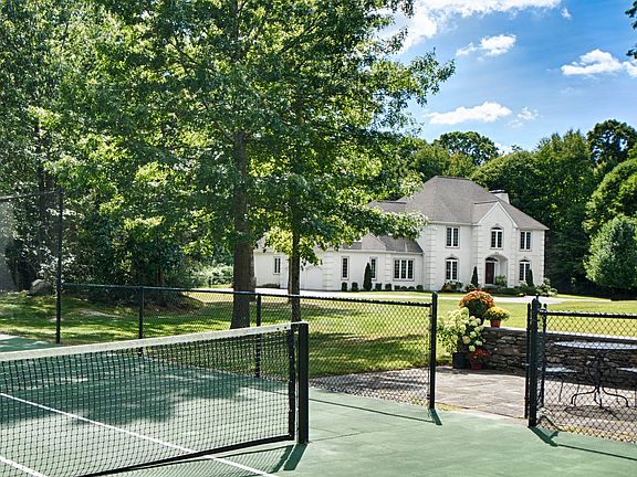 Beautifully sited on over 6.5 acres, enter through stone pillars & gate to a classic stucco colonial with tennis court & in ground pool. This light-filled home has been impeccably cared for by its original owners. Welcoming 2-story entry foyer flows into the formal living & dining rooms, office/library, sun-drenched eat-in kitchen, & family room with wood-burning fireplace. Wonderful guest suite, on the main level, offers its own charming den, full bath, & washer/dryer -- great as living quarters for in-law/nanny. The 2nd level features a master bed/bath suite with a gorgeous fireplace & 2 walk-in closets. French doors lead to an oversized 20x50 Gunite pool (great for laps), surrounded by an expansive flagstone patio. All perfect for entertaining in a private idyllic setting. Special features include a Classic Turf System tennis court; large immaculate basement; circular driveway; fenced in backyard. Conveniently located to New Canaan train station, restaurants, shopping, & hiking.