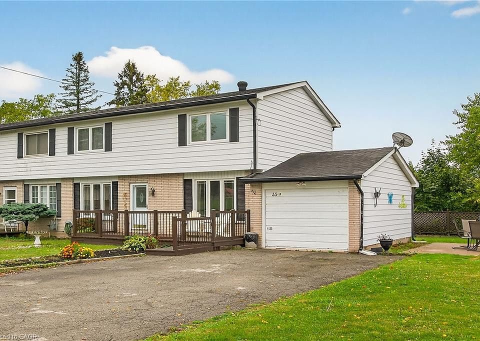 Discover this “Fabulous Freehold” semi-detached home located in Cayuga’s preferred southwest quadrant offering close proximity to schools, churches, new arena/walking track complex, downtown shops, eateries/bistros, children play parks & Grand River amenities inc covered pavilion & public boat launch just minutes away. Relaxing 30 minute commute to Hamilton, Brantford & Hwy 403 with Lake Erie 20 minute drive southwest. This well maintained 2 storey dwelling is positioned handsomely on 66.20ft x 82.50ft serviced lot highlighted with 7ft x 18ft freshly painted street facing deck providing entry to 1,320sf of tastefully appointed, ultra functional living space, 660sf partially finished basement & 260sf single car garage. Inviting front foyer leads to comfortable living room - continues to south side dining room segueing to stylish kitchen sporting modern white cabinetry & tile back-splash - completed with convenient 2pc bath & entry to rear foyer incs walk-out to uncomplicated rear yard & private north side yard enjoying 14ft x 18ft concrete entertainment patio & versatile garden shed. Spacious primary bedroom highlights upper level ftrs roomy hallway accessing huge 2nd bedroom - ideal for guests, 3rd bedroom & 4pc main bath - updated by Bath-fitters enhanced with new glass shower doors. Hi/dry basement level features large family room accented with rustic wainscoting & tucked away storage room leads to adjacent multi-purpose room incorporating storage/utility area & laundry station. Notable extras - all appliances, laminate main level flooring, quality lower & upper level carpeting, n/g furnace, AC, water heater-2019, NEST thermostat, vinyl windows & paved double driveway. Attractive & Affordable - an unbeatable combination!