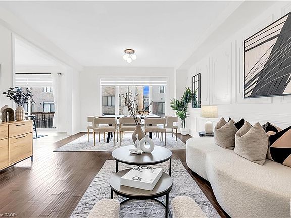 Welcome to this beautifully designed 4+2 bedroom, 4-bathroom detached home featuring a 2-car garage and offering over 3,700 sq. ft. of luxury living space. Every inch of this home has been thoughtfully upgraded with timeless finishes and modern comforts.Step inside to find 9-ft ceilings on the main level, elegant wainscoting details, and a combined living and dining room perfect for entertaining. The family room is an entertainer's dream - featuring soaring 15 ft ceilings, custom built-in shelving, and a floor-to-ceiling gas fireplace, with a walk-out to a private front balcony.The refinished eat-in kitchen is a chef's delight, showcasing top-of-the-line KitchenAid stainless steel appliances, including a wall oven and built-in microwave, stunning quartz countertops, and a large pantry wall. The breakfast area offers a seamless walk-out to your private backyard retreat, upgraded with aggregate stonework - ideal for outdoor gatherings.Upstairs, you'll find four spacious bedrooms, including a luxurious primary suite featuring a spa-inspired ensuite with a double sink vanity and a custom-designed walk-in closet.The fully finished lower level adds incredible versatility, offering two additional bedrooms, a full bathroom, and a kitchenette - perfect for extended family or guests.Located just minutes from local parks, scenic escarpment trails, waterfalls, major highways, and all amenities, this home perfectly blends luxury, comfort, and convenience. Extras: Aggregate Concrete Stone in front and backyard, S/S Fridge, Gas Stove, B/I Dishwasher, Wall Oven & Microwave, Hood Fan, And Front Load Washer/Dryer. Elfs & Window Coverings. Custom Shelving in Great Room, Fireplace, Custom Closets. Fantastic Location! Close To Schools, Community Centre, Library, Hwy 403.