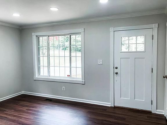 The back yard is fenced in. The property extends nearly an acre through the woods to the left of the house - perfect for building forts or exploring. One neighbor to the right. And one across the street through a tree line.