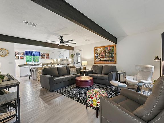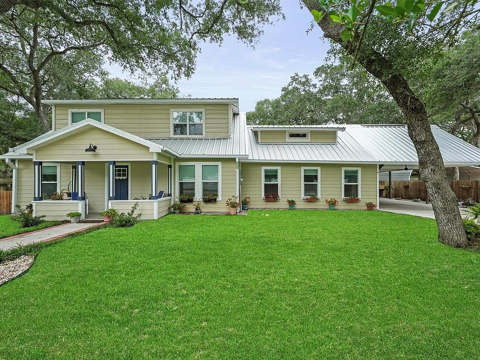 Tucked away beneath a canopy of mature oak trees, this thoughtfully custom built is located on a generous, fenced lot in the heart of Blessing, and features a durable metal roof, expansive covered carport, and a walkable attic—ideal for extra storage or conversion. With a spacious open-concept living area, exposed beams, a chef-inspired kitchen that boasts custom cabinetry, a large island, and eye-catching backsplash tile— this home is perfect for family gatherings. Two bonus flex rooms provide additional space for dining, lounging, office, or craft room. Outdoors, your backyard oasis awaits. Enjoy shaded evenings under the covered patio, complete with a Tiki-style bar, outdoor sink, seating area, custom garden, and firepit. Conveniently located minutes from Blessing Elementary School, Tidehaven ISD, and a short drive to major employers such as Tenaris, Formosa Plastics, STP Nuclear Operating Company, and the Port of Palacios, this home combines location, lifestyle, and lasting value.