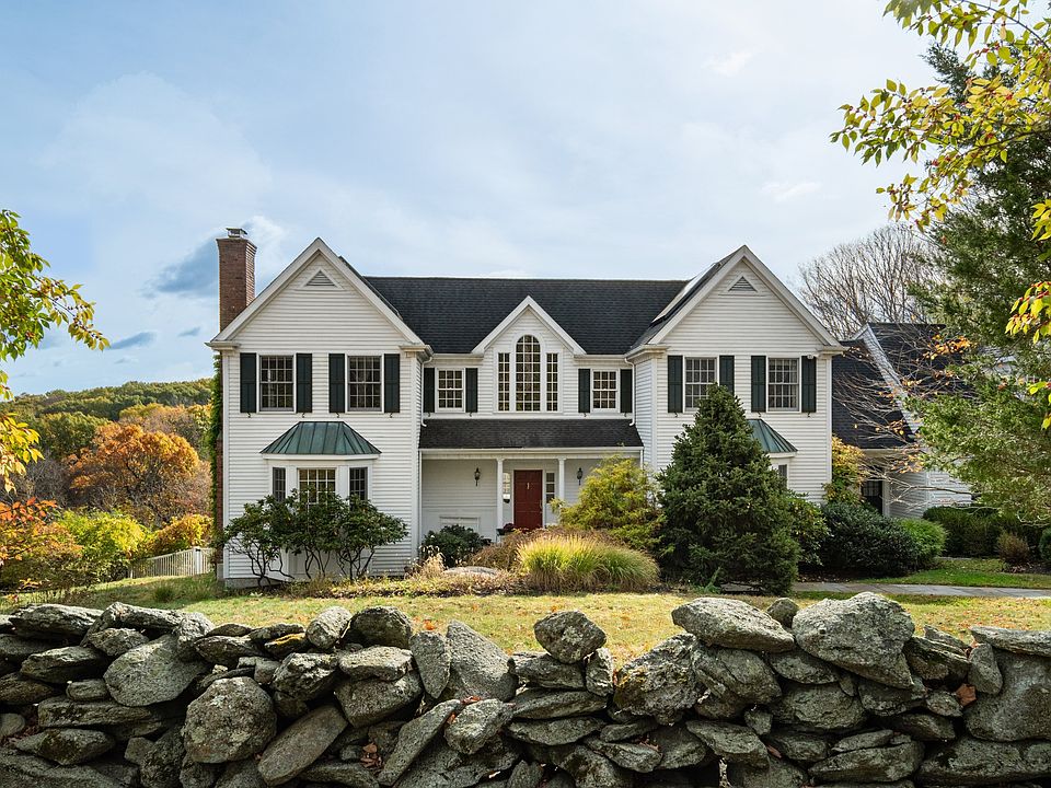 Stunning views, thoughtful upgrades, and exceptional privacy define this beautiful colonial set on 3.8 landscaped acres. A soaring, light-filled entry hall leads to elegant living spaces with refinished hardwood floors, high ceilings, and detailed moldings. The living room with fireplace, an oak-paneled library, and formal dining room offer timeless charm. The custom chef's kitchen features top-of-the-line Gaggenau, Thermador, Miele, and Bosch appliances, including induction cooktop, steam oven, built-in Teppanyaki grill, espresso machine, and wine cooler. The adjoining family room boasts oversized windows, French doors to a mahogany deck, wood-burning fireplace, and full bar - perfect for entertaining. Upstairs provides four bedrooms including a primary suite with his-and-her baths and expansive property views. A bonus room above the garage offers flexible space for work or play. The walkout lower level includes a gym, full bath, and changing room. Outside, enjoy a heated gunite pool, outdoor shower, and stone patio surrounded by mature landscaping and stone walls. Energy-efficient features include Tesla solar panels with two backup batteries and an EV charging station. Convenient to local trails, Woodcock Nature Center, Weir Farm, and shopping in Ridgefield, Georgetown, and Weston. This defines refined country living -elegant, efficient, and effortlessly private.