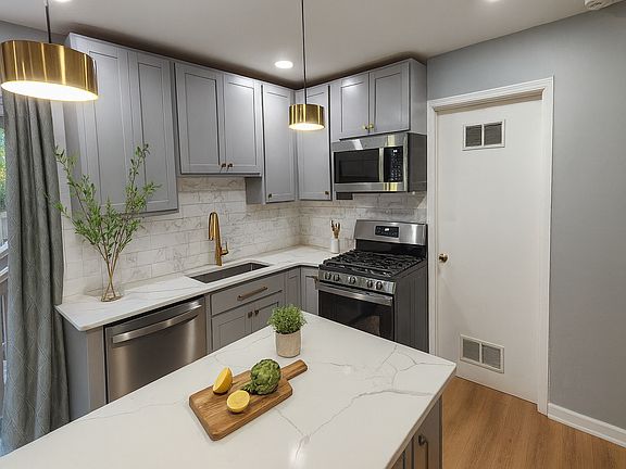 Large fenced backyardSpacious islandCompletely updated kitchenQuartz countertopsStylish backsplashBrand-new hardwood flooringStainless steel appliances