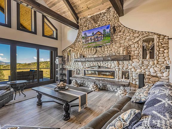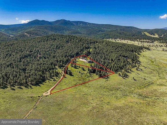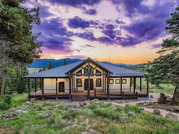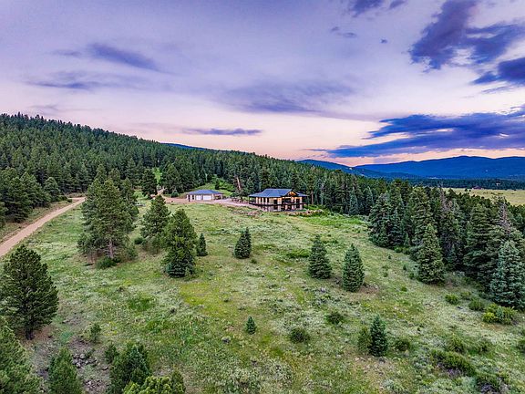 Immerse yourself in the gorgeous Angel Fire beauty with a home to match! 35 Buckskin Road is a home that speaks for itself, with all matter of custom features inside and out. From the beautiful great room with a lovely window wall, exposed wooden trusses, and a fireplace facade made of river rocks handpicked in Dixon, New Mexico and individually stacked in a one-of-a-kind design, every little detail was painstakingly thought through from start to finish. The primary suite boasts a massive ensuite bathroom, with stunning tilework throughout the vanity, walk-in shower, and soaking alcove with a large clawfoot tub. The expansive kitchen is constructed of beautiful, clear sugar pine, accented by a massive blue galaxy granite island and complementary blue tile backsplash for a perfect pop of color. The lower level hosts a wet bar made of the same river rock as the upstairs fireplace, plenty of room for a billiards room or game den, and two guest bedrooms with a full bathroom. Other sought-after features include the laundry room with a built-in dog wash station, the large wrap-around deck with unobstructed views of the surrounding mountains and valley, and the detached, 3-car garage with a workshop and a 1-bedroom apartment, perfect for visiting family, friends, or on-property caretaker. This home sits on a 4.29-acre lot, with the adjacent lot included for a total of 9.63 acres, surrounded by pine trees only 5 minutes from the Angel Fire village center, making it the ideal blend of privacy and convenience for your next mountain retreat. Seller is willing to offer owner financing.