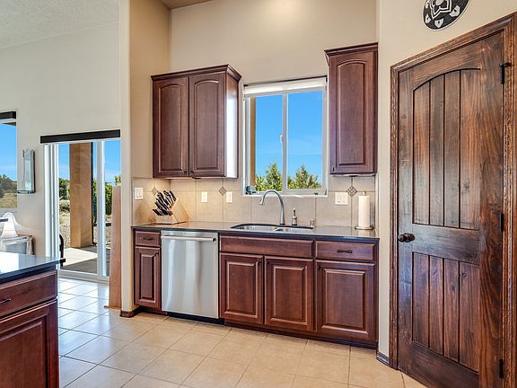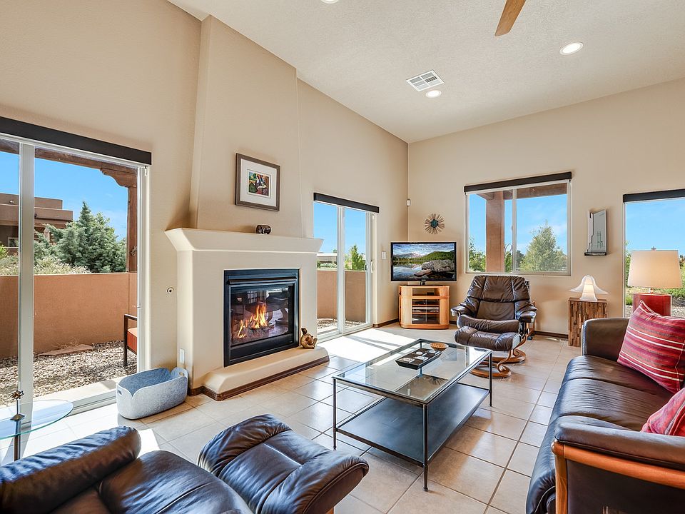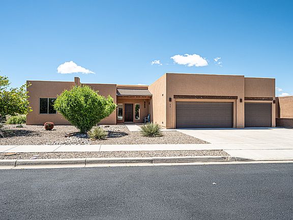 This thoughtfully designed three-bedroom, two-bathroom home offers space, comfort, and elegance in a peaceful neighborhood that is both easy to live in and commute from. The single-level home spans 2,256 square feet and includes a 331-square-foot attached studio (the converted third garage bay)—ideal as a fourth bedroom, office, or creative space. A bright living room with a cozy fireplace invites relaxation, while the modern kitchen features stainless steel appliances, stone counters, and ample space for cooking and entertaining. High ceilings, recessed lighting, and tile flooring enhance the open layout. The primary bedroom is complemented by an en-suite bathroom with double vanities, soaking tub with separate shower, and a generous walk-in closet. Two additional bedrooms provide flexibility for family or remote work. Located in the back of the development with views of green space and close to walking trails, your private outdoor space will feel limitless. Mature landscaping, the covered back portal and large side pergola combine to offer space for gatherings, gardening, or quiet moments. Other features include an attached 2-car garage, central AC and heat, and a roof with transferable warranty. Located near the Dinosaur Trail Trailhead and close to local supermarkets and healthcare, this home combines practical living with Santa Fe charm.