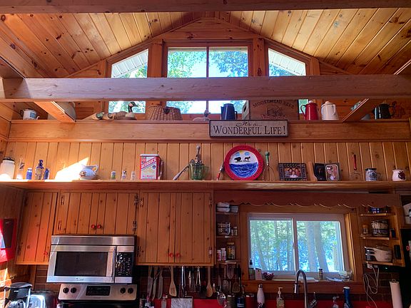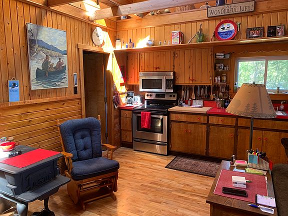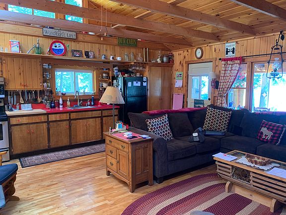 Maine lakefront home for sale on Jackson Brook Lake in Brookton Township. This home sits on 5.13+/- acres of land and has 300+/- feet on the waterfront. The front deck is almost touching the water! This 1500+/- square foot home features two bedrooms, one full bath, a large living room, a kitchen with cathedral ceiling, a large family room, a loft, and a front interior porch facing the lake for morning coffee or afternoon cordials. The property offers a two-car garage, 28 x 24 with a bunk room area above the bays and a storage building that is 12 x 20. There is a boat ramp and dock included. A new septic tank was just installed because the seller found an old metal tank and wanted it replaced with a concrete tank before a sale took place. This is a property that is very well maintained and is a must see!