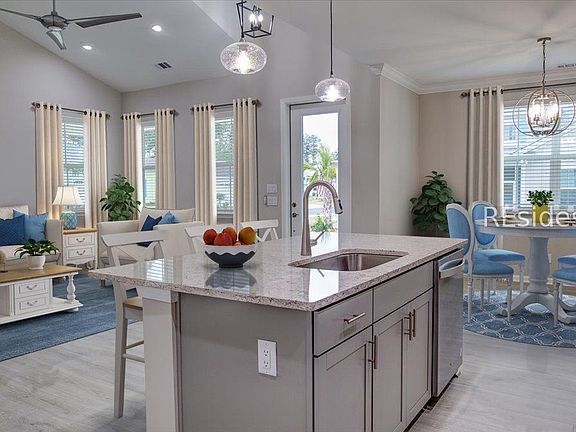 Soothing Neutral tones! Popular 2023 "Dreamsicle Model" Margaritaville cottage on an outside lot w/ green space! Desirable phase 5 location facility!! A short golf cart ride to both the town center and the lake house! A wrap around porch too! Cottage style home w/ many upgrades! Crown molding, natural gas range, refrigerator, Washer and Dryer included- a convenient plus! Elegant 8' doors & 42" soft close cabinets! Upgraded tile & hard surface floors throughout. Quartz countertops! Recessed lights! Exterior painting, landscaping, grass & irrigation included. Wonderful neighbors! Enjoy a vibrant 55+ community w/ a variety of activities & clubs. Experience a "vacation resort lifestyle" everyday.