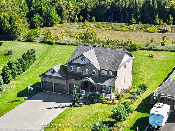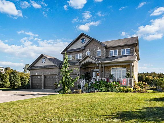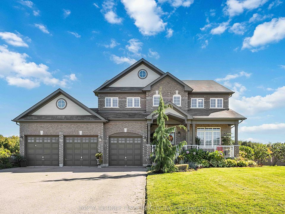 Incredible value and rarely offered 4+1 bedroom, 3 car garage, estate home with walkout basement, on a picturesque 0.7 acre pie shaped lot bordering on pristine conservation land. Welcome to the amazing community of Eden Park, a hamlet of custom built estate homes located on the outskirts of Clarington just a minute from 401 access. Ample parking on the triple wide and extra deep driveway, with landscaped exterior and path to the oversized porch. Inside you'll find 9 foot ceilings and over 3100 square feet that features an open concept layout filled with natural light. Upgraded lighting and flooring throughout the main level, with a stunning and spacious granite kitchen and breakfast area walkout to the elevated deck with pergola and sitting area overlooking the greenspace. The great room is truly the centrepoint to this layout, with 15 foot ceilings open to the above hall, granting panoramic views from both levels, and a gas fireplace for cozy evenings. The main floor laundry with access to the huge 3 car garage has a brand new washer and dryer. The upper level is entirely done in gorgeous bamboo flooring, with the primary bedroom boasting a deep walk in closet, and large 5 pc ensuite with dual sinks, granite counters and soaker tub. Additionally, the 2nd bed offers his and hers closets with built in custom shelving. The 3rd and 4th beds are both spacious with large windows, and a large 4 piece main bath with granite counters. What more could you ask for? How about a bright walk out basement with an additional finished 5th bedroom, and some interior walls installed just waiting for your finishing touches!