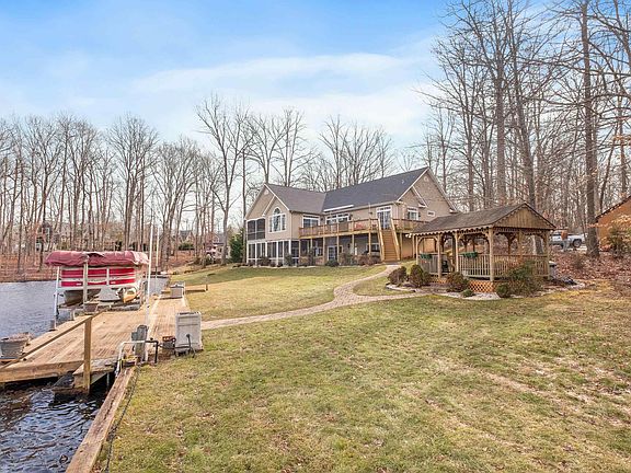 Stunning Waterfront Dream Home at Lake Monticello! Welcome to this breathtaking custom-built home, perfectly designed for spectacular main lake views from the moment you arrive on the property. Gentle, easy access to the water, offering excellent swimming water & an expansive grassy backyard making it the ultimate retreat for gathering w/ friends & family. A Parade of Homes Winner for Best Primary Bedroom & Overall Home, this masterpiece was built by Southern Homes w/ an emphasis on craftsmanship & comfort. Interior Highlights: Primary suite w/ tray ceiling, lake views, double walk-in closets & 2 separate private bathrooms. Open-concept living, vaulted ceilings, sunroom, hardwoods, expansive Anderson windows framing stunning lake views, 3 fireplaces, including 1 in the dedicated office space. Gourmet wet bar, perfect for entertaining. Pocket doors, elegant columns & detailed trim work. Main-level laundry. Private Walk-Out Terrace Level: A Spacious Layout Perfect for guests! Featuring its own beds/bath, living spaces. Bonus room above the garage (potential additional living space) 2 screened porches, gazebo w/glider, boat lift, awning, concrete patio, wired for hot tub, storage room. New roof 2024!! Roughly 200' of waterfrontage.