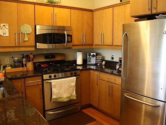 This top floor, corner facing unit features 1076 square feet of living space. Built in 2007, this two bedroom, two bath condo features an open floor plan. The sleek kitchen has granite countertops, stainless steel appliances and maple cabinetry. There are hardwood floors throughout the living and dining areas. The master suite has a magnificent en-suite bathroom with a luxurious walk-in closet. Central air throughout with in-unit laundry. The building offers a common patio, fitness center and elevator. One garage parking space and one outdoor parking space is included with the rent. Within close proximity to the green line train. Located in the desirable Ward school district. No smoking permitted