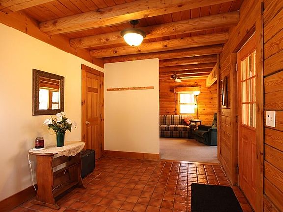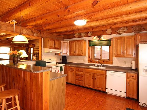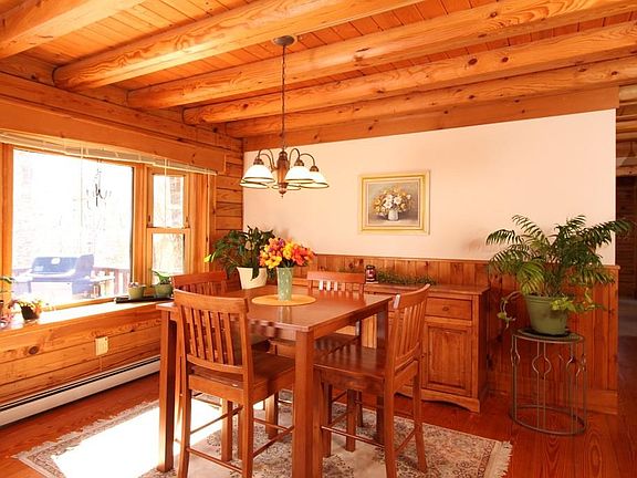 A unique opportunity to own a modern custom log home nestled on a 3+ acre lot near center of town! Log construction with solid Southern yellow pine logs 9 " thick that provide natural insulation and character.Main floor has open concept with kitchen,dining room and family room, all with beautiful exposed ceiling beams and pegged wide pine flooring.Bay windows provide scenic views of gardens and Interior walls are sheetrock to provide space for décor and charm.4 Bedrooms, one on first floor that has private bath - perfect for use as Master, guests or potential inlaw. Very large bedroom on second floor has a separate flue for stove hookup. Triple pane Newpro windows add to energy efficiency and the Harmon pellet stove will convey. New roof in 2005, new boiler in 2009, water treatment system in 2014,Title V has passed! Wrap around farmer's porch connects to large deck in rear of house that overlooks private wooded area-perfect for entertaining. A real retreat spot yet close to everything