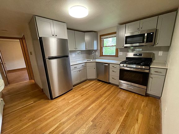 Nicely updated 2 bedroom, 1 bath apartment unit with cathedral ceiling living room, updated eat-in kitchen with stainless steel appliances (microwave, dishwasher, disposal, stove & refrigerator) with quartz counters, newer bath, hardwood floors, fresh paint, storage area, common laundry, 2 parking spaces and more!