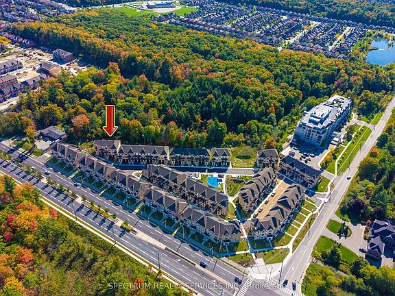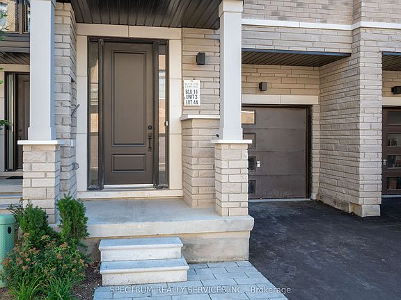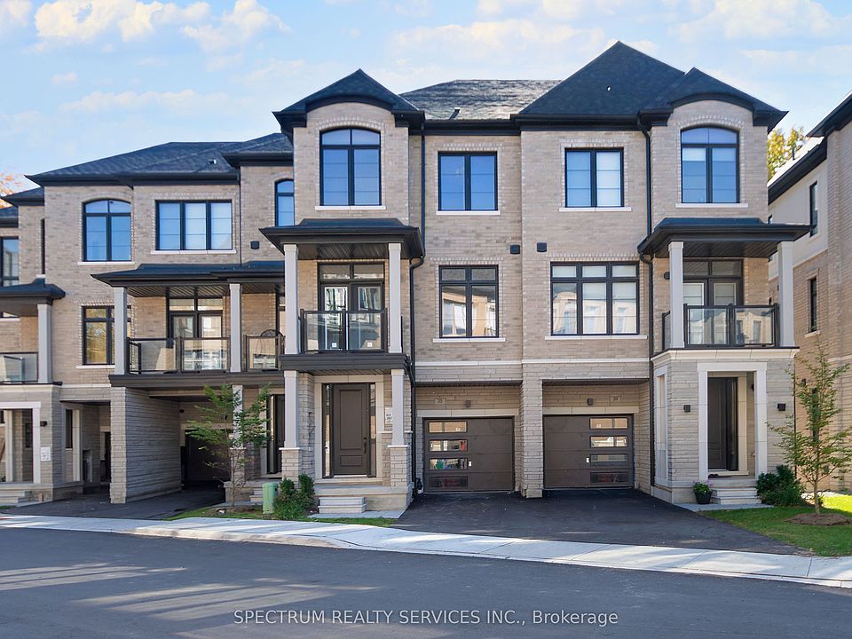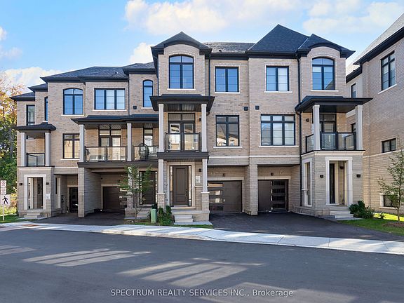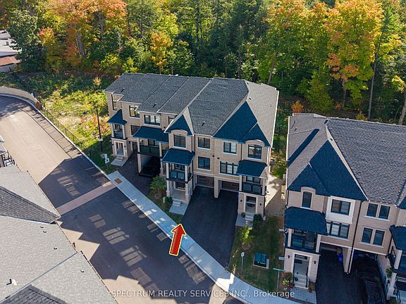 Discover refined living at Archetto Woodbridge Towns with this crème de la crème townhome offering 2,345 sq. ft. of beautifully designed space. Backing onto a peaceful woodlot, this home offers serene views from the den, great room, and primary bedroom. Enjoy hardwood floors throughout the ground floor, main level, and upper hallway, with cozy broadloom in all three spacious bedrooms. The ground-floor den features double French doors, a 2-piece ensuite, and a walk-out to a wood deck to the private rear yard. Considerate design continues with a mudroom providing access to the garage and laundry room. The open-concept main level shines with an upgraded white kitchen, waterfall island with breakfast bar, ceramic backsplash, and walk-through servery with custom pantry and cabinetry. A hardwood staircase with iron pickets leads you upstairs where the primary retreat impresses with two walk-in closets, a luxurious 5-piece ensuite, and a private balcony overlooking the woodlot. The second bedroom includes its own walk-in closet, while the third bedroom boasts a large window with a cheerful north view. A modest unfinished basement awaits your personal touch. Complete with a single-car garage and private driveway (2-car parking total). Bonus: Enjoy One Year of Free Condo Maintenance Fees, Central Air Conditioning, and Capped New Home Closing Costs!