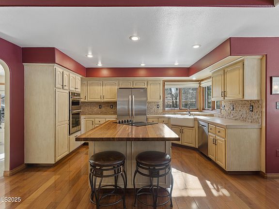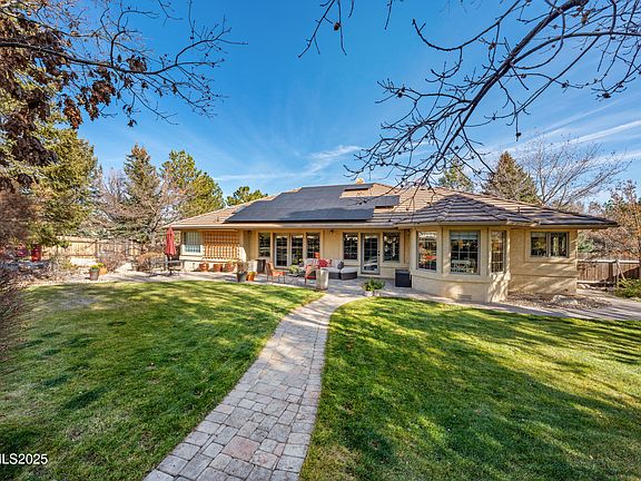 With a built-in Tesla charger and solar with battery backup (that is completely paid off), this South Reno property delivers a lifestyle that's modern, efficient, and unmistakably cool from the moment you arrive. Set on a rare .52-acre lot in one of South Reno's most sought-after communities, this home blends space, style, and location in a way that's increasingly hard to find. Mature trees, layered landscaping, and blooming gardens surround multiple paver patios, creating a backyard that feels private, peaceful, and built for entertaining. A large concrete patio offers the perfect setup for hosting, basketball, street hockey, or gathering under the stars. Step inside and you're immediately greeted by gorgeously remodeled bathrooms—completed this year—that feel straight out of a design magazine. From the finishes to the fixtures, every detail was thoughtfully selected, creating spa-like spaces that elevate everyday living. Brand-new carpet throughout complements the fresh, updated feel throughout the home. The floor plan offers both openness and flexibility. A welcoming great room anchors the home, while formal living and dining rooms provide elegant spaces for entertaining or quiet evenings in. An additional room (not included in the bedroom count) is ideal for a home office, gym, or creative studio—designed to adapt to your lifestyle. With 4 bedrooms and 3.5 bathrooms, there's room for everyone to spread out while still feeling connected. Outside, gated parking behind the fence adds convenience for toys, trailers, or extra vehicles. The location is hard to beat—just around the corner from highly regarded schools, minutes from South Reno amenities, and a short drive up the hill to Lake Tahoe and world-class ski resorts. Whether you're heading to the slopes, the trails, or simply enjoying your own backyard oasis, this home supports a life well lived. Modern. Thoughtfully updated. Exceptionally located.