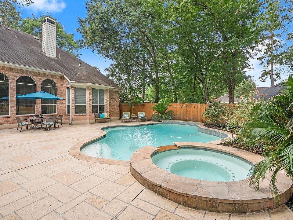 Tucked away on a peaceful cul-de-sac in desirable Alden Bridge, this charming David Weekley home offers 4 bedrooms, 3.5 baths, and inviting spaces throughout. Enjoy relaxing on the wraparound porch or in your private backyard retreat with pool and spa. Inside, the bright family room features expansive windows with serene pool views. The open kitchen flows into the sunroom, breakfast nook, and family room—perfect for everyday living. A spacious primary suite offers dramatic windows, a luxurious bath with jetted tub, oversized shower, dual vanities, makeup area, and a large walk-in closet. Two staircases lead to a generous game room with bar and two full baths upstairs. A private office with French doors and built-ins is ideal for working from home. Fresh paint and new carpet throughout. Walk to parks, trails, tennis courts, a pool, and top-rated Buckalew Elementary. This warm and welcoming home is ready for you to move in and make it your own.