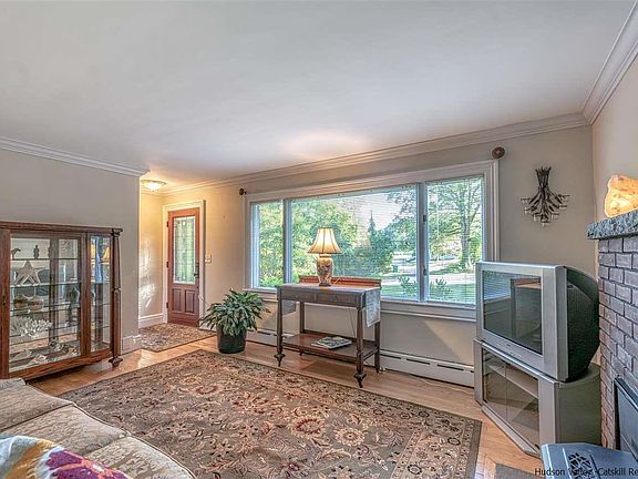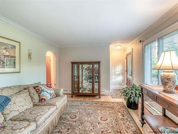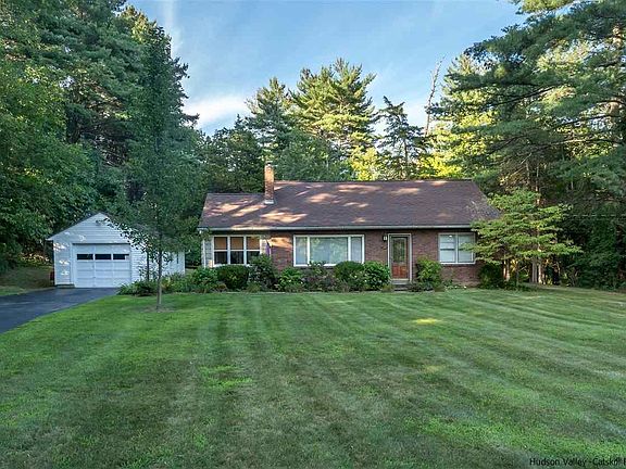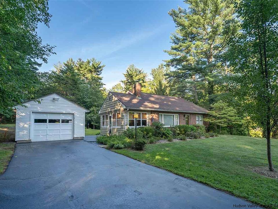 Set back off the road is this 2 bedroom 1 bathroom cape that has been loved and cared for over the years and pride of ownership is evident on just over ¾ of an acre in Hurley. With dogwood trees and mature landscaping that surround this home the feeling of tranquility and peace are offered. The combination of solid brick and the ship lap style siding in conjunction with the mahogany leaded glass front door and metal gutters is just the beginning. As you walk inside thru the 3 seasoned room with windows that surround with tiled floor you can begin to imagine enjoying your morning coffee out here every day. Step inside to the eat in kitchen you will take notice of the solid wood cabinets that were recently painted with new hardware that accents the wide white pine reclaimed floors. The tiled black marble countertops and new light fixtures just make this kitchen even more appealing. Large picture window in the living room that overlooks the front yard allows for plenty of sunshine. Brick fireplace with pellet stove and blue stone mantle is perfect for those chilly nights. Crown molding, new castings and sills are noticed throughout the home. Down the hallway there is a full bathroom with new vanity and toilet make sure you don't miss out on the heat/fan/light combo on a dimmer switch. There are 2 nice sized bedrooms located on either side of the bathroom which are filled with natural light and have decent sized lighted closets. Upstairs there is a full walk up attic which could easily be converted into another bedroom one day, or just keep it as is and use for storage. One car detached garage that has a workshop extension off the back is great for that or a garden/potting shed. Close to uptown Kingston, yet a more remote setting. This home really needs to be seen in order to appreciate.