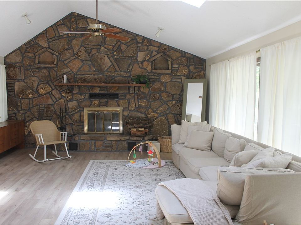 - Ceiling Fan(s), Eat-in Kitchen, None, Pantry, Skylights, Wood Burning Stove
