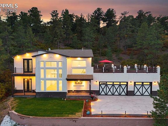 Experience Colorado living at its finest in this new custom home nestled in the hills of Woodmen Valley, offering stunning views and a refined sense of comfort. This residence combines elegant design with practical livability, framed by panoramic vistas that include Blodgett Peak. Step inside to a dramatic two-story entry and living room, where expansive windows fill the space with natural light and showcase the surrounding scenery. A graceful curved staircase adds architectural interest and connects the home’s open spaces. The chef’s kitchen features leathered granite countertops, a large island ideal for entertaining, and all appliances including two dishwashers, two ovens, a downdraft cooktop with pot filler, refrigerator, and wine cooler. The main level also includes two bedrooms, or 1 bedroom and office with balcony. There is a spacious full bath with dual sinks and quartz countertops, plus a conveniently located half bath. The primary suite provides a private retreat with wrought-iron doors opening to a balcony over looking city lights, a spa-style bathroom with a freestanding soaking tub, walk-in rainfall shower, dual vanity, and backlit mirrors. Also upstairs, you’ll find two additional bedrooms, a full bath with dual sinks and quartz countertops, and a well-placed laundry room. Entertain or unwind on the expansive party deck while taking in sweeping views of Blodgett Peak and the natural beauty of Colorado Springs. Additional highlights include hardwood flooring, an open-concept layout suited for modern living, and a large garage with an extra 9'x26' flex room—perfect for a workshop, hobby area, man cave, or additional storage. Located in award wining school District 20 you will be minutes to I25, shopping and restaurants. Close to mountain activities with parks and hiking trails, this home blends modern luxury with timeless Colorado appeal. Act quickly on a rare opportunity to own a new home in a popular north west side neighborhood.