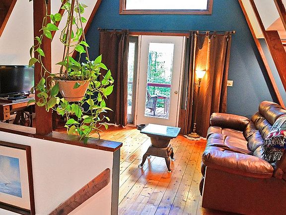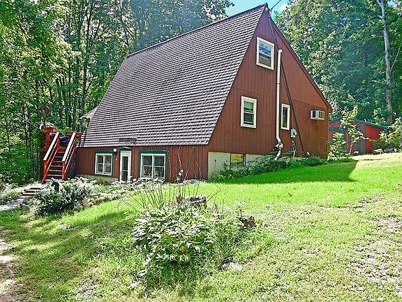 Delayed shows begin Saturday Sept 18th 9:30-1230 A must see modified A-frame home with 2-3 bedrooms, 1 bath, a loft, de-attached 2 car garage, nestled on 1.3 acres in desirable Derry. The oversized 2 car garage boasts 12 foot doors with torsion door openers and a finished epoxy floor. Enjoy the cozy living space next to the hearth and woodstove. This post & beam home exudes creativity and offers a basement workshop, laundry and service room to best work on your next projects/ chores! The bright and open eat-in kitchen/dining offers lots of space for entertaining. The real tongue/ groove wood floors and beams create a warm and inviting space. The bonus loft space upstairs offers alternate office or guest room. Outdoors you are enveloped in mature trees and lush ground cover of perennials and hostas galore! The deck off the living room overlooks the green grounds, outdoor firepit, vegetable garden, and an additional large outbuilding. Only 10 minutes to Derry shopping & restaurants.