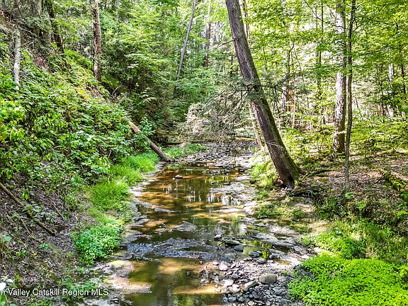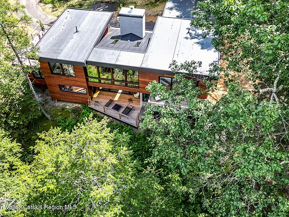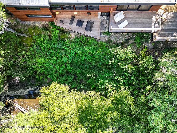 Perched sixty feet above the Muddy Kill Creek in Stone Ridge, this newly built home, named ''Fern Hollow'', blends mid-century modern inspiration with one-of-a-kind details, offering both striking design and emotional warmth that sets it apart from standard new construction. The result is a modern treehouse, with dramatic views of the creek as it weaves through the lush wooded landscape. The builders took great care to infuse character into the home by incorporating reclaimed architectural pieces throughout. Vintage terrazzo floors, custom-designed door hardware, and an unforgettable walk-in closet—crafted from the cabinetry of a 1960s library—are just a few examples of the artistry. Every detail has been curated, creating a home that is elevated yet approachable. With a nod to Frank Lloyd Wright's sense of surprise, the foyer's understated character is bright and welcoming, giving way to the soaring main living space, where expansive glass walls frame the forest canopy and the creek below. A wood-burning fireplace provides warmth and a striking focal point, while two oversized doors extend the living area outward, opening directly to the decks and blurring the line between indoors and out. A hidden mechanized television drops down from above the fireplace, maintaining the clean lines of the room until it's time to gather for a movie night. The kitchen is equally thought out in form and function, with soapstone counters, custom oak cabinetry, a coffee/dry bar, wine fridge, and a dramatic picture window in place of a backsplash, looking directly into the forest. A disguised door is integrated into the kitchen cabinetry, leading to a hidden first-floor suite—perfect for guests, in-laws, or a quiet office retreat. The sleek, moody mudroom just off the carport (with an EV charging station) leads to a powder room and laundry area with a chute, as well as a generous flex space suited to a gym, media room, or playroom. Upstairs, spalted maple floors run throughout. The spa-like primary suite is a tranquil, spacious retreat that opens to a hot tub ready private deck where you can unwind with the creek's quiet rhythm as your backdrop. Completing the suite is a spa-like bathroom featuring a luxurious soaking tub and walk-in shower, along with a walk-in closet whose custom millwork nods to its origin as a mid-century library. Another guest room, a stylish full bathroom, and an open loft leading to a large deck round out the second floor, offering both comfort and flexibility for family or visitors. Additional features include polished concrete floors with radiant heat on the first level, mini-splits throughout for cooling and additional heating, and wiring in place for a whole-house generator. Set at the end of a private road, the property is secluded and peaceful, with frontage on both sides of the Muddy Kill Creek and mature trees that create a timeless natural sanctuary, yet it's just minutes to the center of Stone Ridge and a short drive to Accord, High Falls, New Paltz, and the area's farm stands, breweries, and dining destinations.