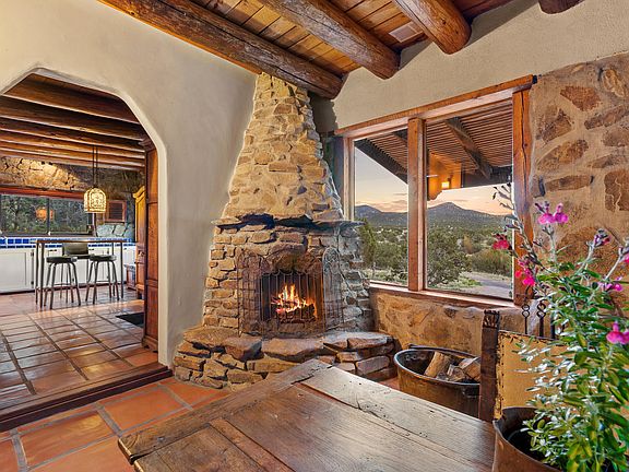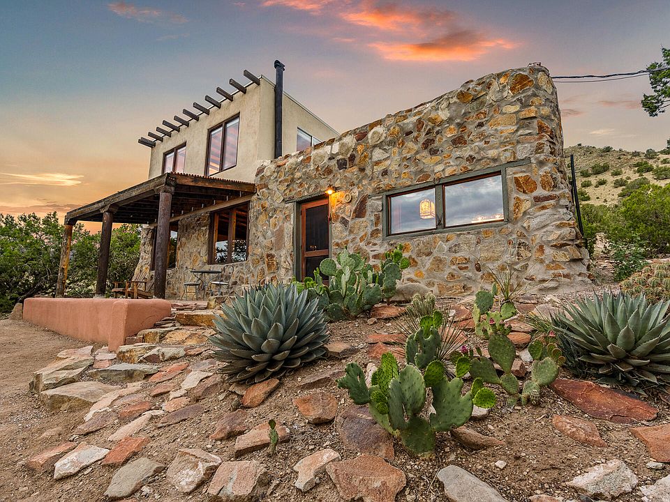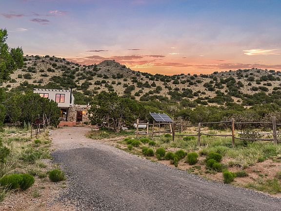 Experience sustainable Off-Grid living in a truly unique and artistically designed home. A One bedroom, one full bath Artist retreat in Madrid, New Mexico with solidly built craftsmanship. Every detail speaks to inspiration and integrity--from the hand-poured, etched entry threshold, the turquoise inlay to the artisan stone walls, hand-hewn vigas, and thick reclaimed timber beam window ledges. A mosaic tile inlay graces the foot of the richly grained hardwood staircase, and a striking stone-clad fireplace anchors the living space with warmth and enduring character. Designed for comfort and sustainability, this home offers a holistic lifestyle in a truly inspiring setting. The spacious bedroom opens to sweeping, unobstructed views set at the base of Cerro Chato and facing the majestic Ortiz