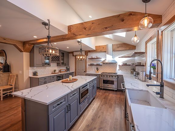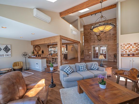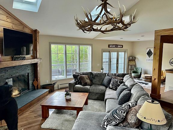 The best of all worlds... This luxury ski home sits at the end of a short serpentine drive with utter privacy, stunning ski mountain and sunset views, yet with easy access to the Mount Snow ski resort, nearby MOOver shuttle service, direct snowmobile trail access, and the village of Wilmington and nearby lakes. This home has just been completely overhauled both inside and out to afford immediate enjoyment. Inside you are treated to a gorgeous open concept floor plan with vaulted great room, amazing natural light, exposed beams, a wood burning fireplace with new tile and rustic wood facade, large dining room with exposed beams, stunning chefs kitchen with marble counters, large island, stainless appliances, farmhouse sink, tile backsplash, buffet, and walk-in pantry, a main floor vaulted master suite with spa like bath and dream closet, main floor office murphy bed for overflow sleeping and full bath, 3 upstairs vaulted guest bedrooms and two full custom baths, a walkout lower level guest bedroom en suite, amazing family room with wood stove and extra space to entertain, a large 3 car garage, dual mudroom entries perfect for gear and storage, a spacious deck to enjoy the view, dual up and down laundry rooms, ample parking, and more, totaling 5630 sqft of amazing turn key space. Add to this all new windows, a new roof, new siding, new floors, new tile, fresh paint, and mini splits for whole home a/c, and you have a year round retreat that is ready for the discerning buyer.
