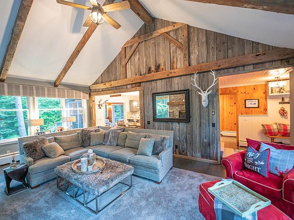 Absolutely stunning and spacious home overlooking a babbling brook and just a short drive from the Mount Snow ski resort. This beautiful home sits nestled at the back of the Joans Ridge community, on a private wooded lot, with direct access to a VAST snowmobile trails, and nearby access to the local restaurants, shops, golf courses, and lakes. The inside has been completely renovated to afford immediate turn key enjoyment, and amenities befitting the ideal year round mountain retreat. Features include a large great room living area with vaulted ceilings, floor to ceiling stone fireplace, exposed barnboard and beams, wide pine floors, a gorgeous kitchen with stainless appliances, custom cabinets, and quartz counters, a panoramic window den to enjoy the outdoors from inside, a main floor master suite with spa-like marble bath, 3 large bedrooms upstairs with 2 full bathrooms and tiled showers, a full walkout lower level with family room, bunk room, and laundry, and a great mudroom entry and storage throughout for gear. There is also a large driveway with plenty of parking, toy shed, stone patio and hot tub next to the brook, large deck for entertaining, covered front porch, and unique screened in gazebo with access off the deck for all season outdoor enjoyment. All of these features, as well as direct sewer and a new roof, mean this home is ideal for downtime, not upkeep, with tremendous rental potential as well!