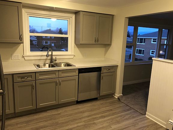 Beautifully renovated apartment with stainless steel appliances, grey kitchen cabinets, countertops, luxury tile flooring, carpeting, vinyl windows, bath tub surround and fixtures, lighting fixtures, bathroom cabinetry, and much more. This cozy apartment includes heat, water, maintenance, lawn care, and snow removal.
