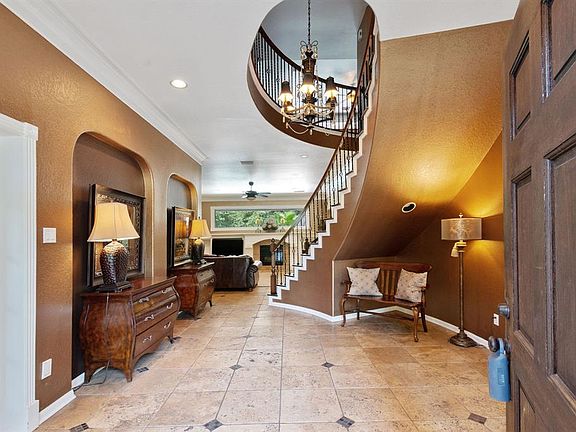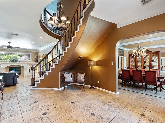 Impressive 2-story colonial home, professional landscaping. Freshly painted throughout! Expansive foyer leads to elegance and style throughout, with custom wall treatments, window treatments/drapes, plantation shutters, chandeliers. Private study with built-ins. Living room features cozy fireplace and is open to kitchen, breakfast room. Formal dining with easy access to a chef's dream kitchen with exquisite granite countertops, 42" oak cabinets with undermount lighting, large center island, gas stove. Breakfast room has a great view of backyard oasis. Elegant master bedroom on main floor has bay window, large bath with separate jetted tub/large seamless shower, 2 walk-in closets. A beautiful curved staircase leads to large upstairs gameroom with wood flooring, separate media room, 4 bedrooms, 3 full baths. Dream backyard oasis with tropical pool with 8 person spa, rock waterfall, outdoor kitchen, gazebo, firepit, batting cage/pickleball court. Texas sized yard in a great location!