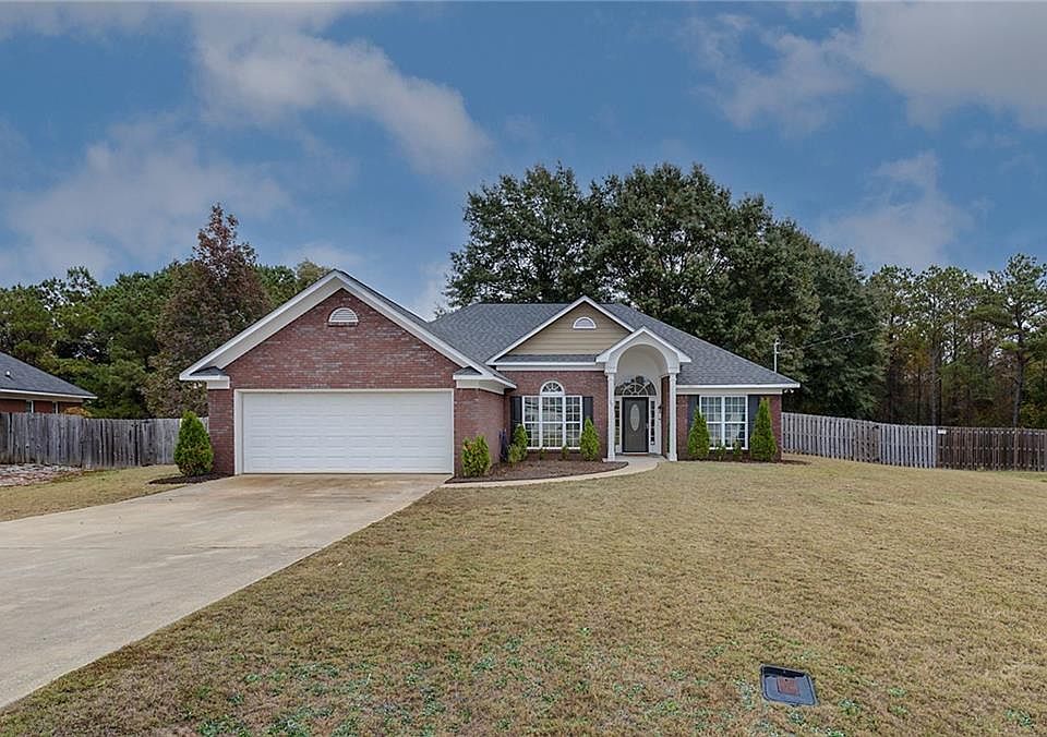This all-brick 3-bedroom, 2-bath home is nestled on a spacious ½-acre cul-de-sac lot in one of Smiths Station’s desirable neighborhoods. With a 2-car garage, split floor plan, and inviting fireplace, this home offers both comfort and functionality. The kitchen features granite countertops, while the primary suite boasts his-and-hers closets. Step outside to an entertainer’s dream—an oversized back deck complete with a custom-built entertainment station and a secure sliding gate perfect for little ones or pets.Storage is no issue with two large sheds (12x24 & 10x20) ideal for workshops, hobbies, or additional space. The backyard is fully privacy fenced, creating a peaceful oasis for relaxing or entertaining. Located within the sought-after Smiths Station school district, this home checks all the boxes.