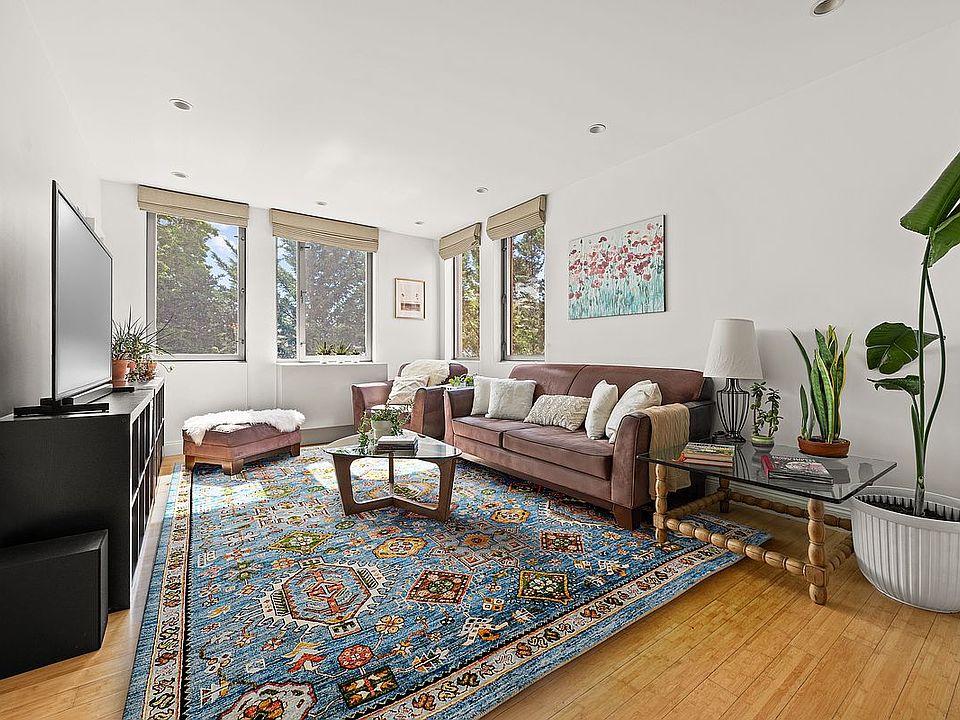 Stunning, sunny and spacious two bedroom condo with an incredible chef's kitchen, complete with a private balcony and its own deeded parking spot! With beautiful finishes and clean contemporary lines, this 2nd floor sanctuary offers an unparalleled amount of space and light. Revel in the enchanting views: lush trees and garden views from the living room and bedroom windows, a benefit of this unit's prime location within the building - and the buildings' unique set back from the street, with its grand circular driveway.
