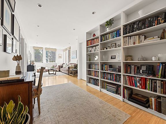 The expansive living room, graced with four oversized windows and dual exposures, provides an abundance of natural light and an airy atmosphere. Adjacent to the living room and kitchen lies an additional versatile space—ideal as either a double living room or a sophisticated library and office, as currently styled by the owners.
