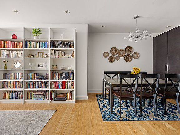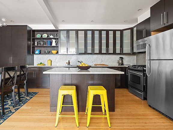 Discover one of Brooklyn's most expansive eat-in kitchens, a rare find that is perfect for culinary enthusiasts. This gorgeous concept kitchen has elegant Carrera marble countertops and backsplash, stainless steel GE Profile appliances, and an abundance of custom glass and lavish espresso wood cabinetry including a pantry. Whether you’re indulging in a casual breakfast at the island counter or hosting a dinner party for eight or more, your inner chef will flourish.