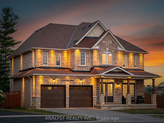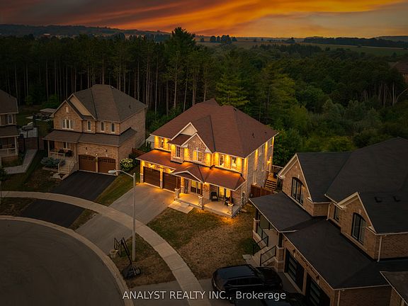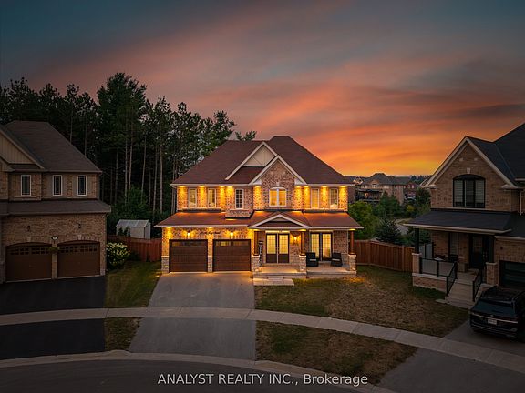 Absolutely stunning 4-bedroom detached home situated on a premium ravine lot with a massive 99.5 ft pie-shaped backyard, offering ultimate privacy and breathtaking views. Located in one of Tottenhams most sought-after communities, this modern residence features a functional open-concept layout, upgraded kitchen with extended cabinetry, quartz countertops, stylish backsplash, island, and stainless steel appliances. The main floor showcases hardwood flooring throughout, a large family room with gas fireplace and elegant waffle ceilings, as well as a dedicated home office perfect for remote work. Upstairs, the oversized primary retreat boasts a spa-like ensuite with glass shower and double vanity, while each additional bedroom offers generous space and natural light. Enjoy outdoor living with a deep, beautifully landscaped yard backing onto a tranquil ravine setting. This is the perfect blend of luxury, comfort, and nature.