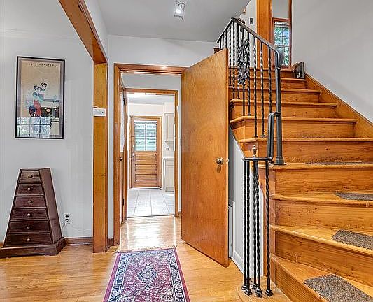Upstairs, the home offers a master bedroom suite with a full bath and four additional bedrooms with a hall bath, all conveniently located on the second floor for easy accessibilityan ideal layout for families. The finished basement includes two large versatile rooms, a full bath, laundry area, utility closet with gas heat, ample storage, and a direct exit to the backyard, combining functionality with charm in a sought-after neighborhood.