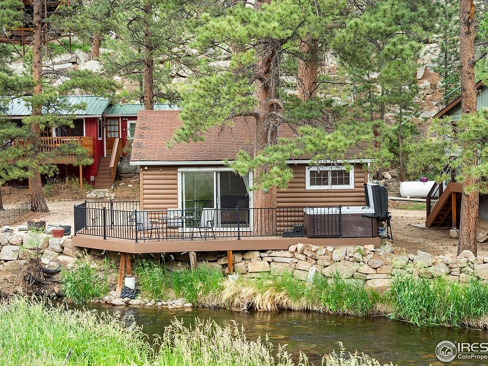 Escape to the mountains without sacrificing comfort or style! This renovated riverfront cabin offers all the charm you want, and none of the updates you don't want to tackle, in a stunning Rocky Mountain setting. Inside, you'll find 2 bedrooms, 1 bathroom, a thoughtfully designed open living space with stylish finishes, and a warm, inviting feel throughout. There's a cozy fireplace, new retro-style appliances, and light, modern touches that feel fresh and welcoming. The kitchen's open shelving, vintage-inspired fridge, and wood accents make it as functional as it is cute. The great room opens to the outdoors through sliding glass doors, leading to the true showstopper: your private deck built right over the river, complete with a hot tub. Soak, dine al fresco, or just relax and listen to the water rush by. Bonus: there's even a tree thoughtfully growing through the deck, blending the cabin perfectly into its natural surroundings. Located just minutes from Estes Park, this one-of-a-kind cabin offers that hard-to-find combo of comfort, charm, and true Colorado character. Unlike so many cabins at this price point, this one is move-in ready-free of dark paneling, outhouses, and dated carpet. Just bring your weekend bag and start enjoying everything this peaceful retreat has to offer. Pure Colorado magic.
